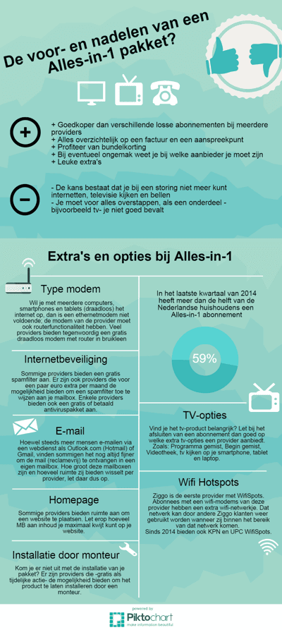 Nog geen Alles-in-1 pakket? Het afnemen van internet, telefonie en tv bij één aanbieder is goedkoper dan verschillende losse abonnementen bij meerdere providers. Een ander voordeel is, dat je één nota en aanspreekpunt voor alle diensten hebt. In onderstaande infographic zetten we alle voor- en nadelen nog even op een rijtje en geven tips voor ‘extra's en opties’ bij het kiezen van een totaalpakket.