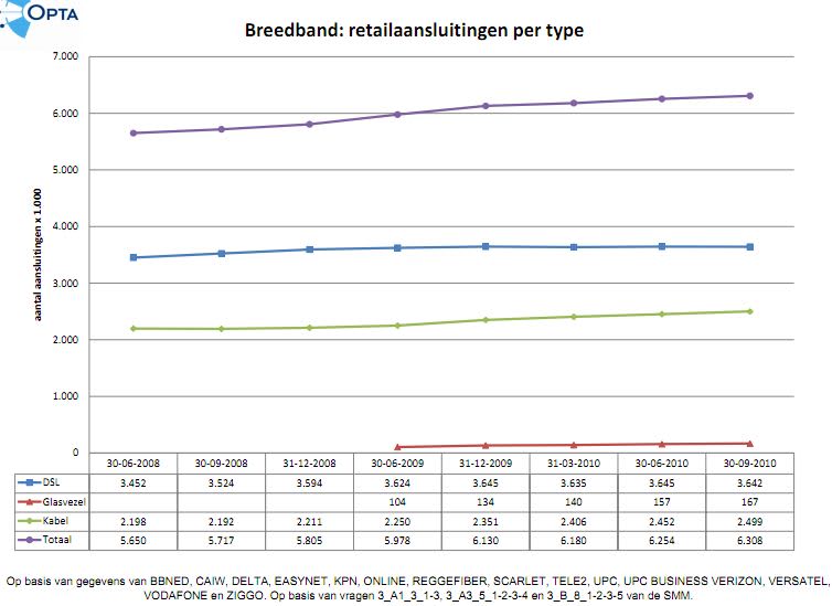 Het totale aantal breedbandaansluitingen is met 54.000 toegenomen. Daarvan zijn er 3,6 miljoen over ADSL, een daling met 3000 in drie maanden. Het aantal over kabel groeide met 47.000 tot 2,5 miljoen. Glasvezel kreeg er 10.000 aansluitingen bij en heeft nu 167.000.