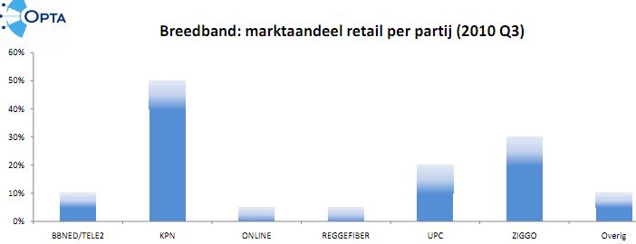 KPN heeft nog steeds het grootste marktaandeel voor breedband, gevolgd door Ziggo en UPC.