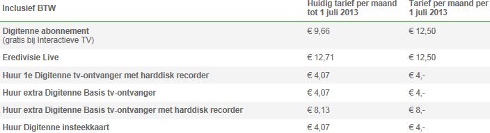 De maandelijkse kosten van Eredivisie Live en de huurkosten van de Digitenne ontvanger of Insteekkaart worden iets verlaagd. Het gaat hier om een paar dubbeltjes, om zodoende weer mooie ronde bedragen te krijgen na de btw verhoging in oktober vorig jaar. Zo gaat Eredivisie Live naar € 12,50 (was € 12,71) en zowel de ontvanger als de insteekkaart naar € 4 (was € 4,07).