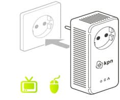 verbindingsset 200 Plus, die optioneel bij te bestellen is. De set bestaat uit twee (of drie) apparaatjes die je in je wandcontactdoos kunt stoppen. Het internetsignaal voor de tv kan op deze manier, vanaf het modem, worden verzonden over het elektriciteitsnetwerk. De internetverbinding voor de tv komt zo dus uit het stopcontact. De set kost 30 euro voor 1 tv (2 adapters) en 40 euro voor 2 tv's (3 adapters).