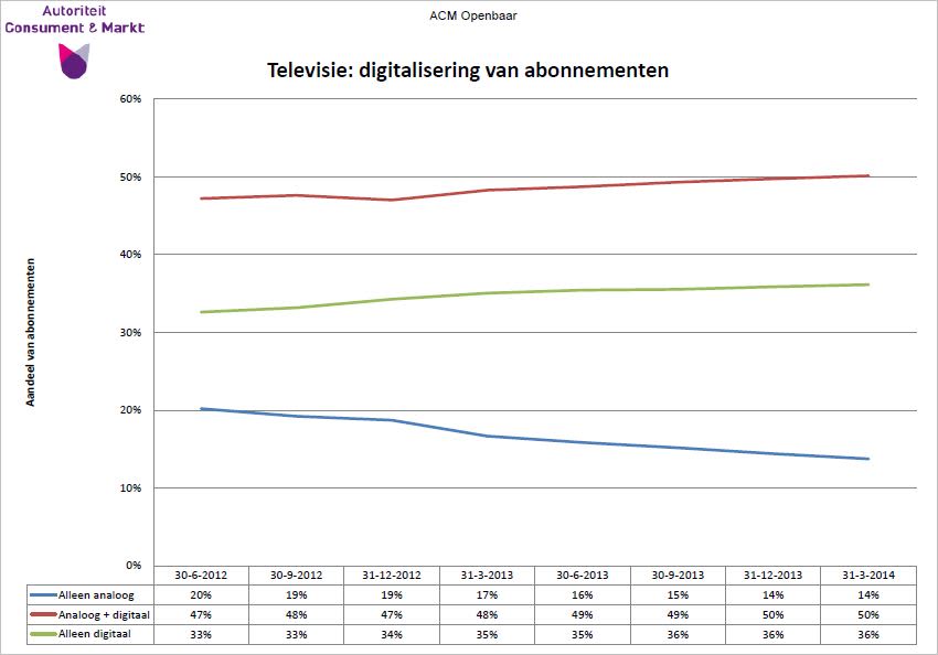 De helft van de abonnementen is analoog én digitaal, terwijl 36 procent alleen digitaal is. In onderstaande grafiek uit de Telecommonitor van het eerste kwartaal toont ACM de digitalisering van de abonnementen over de afgelopen twee jaar.