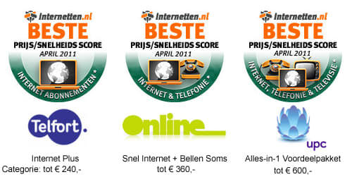 De iPing prijssnelheidstest van april 2011 laat voor de 14e achtereenvolgende maand een nummer 1 positie zien voor Telfort in de categorie internetabonnementen tot € 240,- per jaar. In de categorie Internet + Bellen abonnementen heeft Online concurrent Telfort van de troon gestoten en staat nu op de eerste positie met het Snel Internet + Bellen Soms pakket. Tele2 heeft de tweede plek in deze categorie opgeëist. In de categorie Internet, Bellen en TV blijft UPC deze maand wederom ongeslagen op de eerste plek in de categorie tot € 600,- staan.