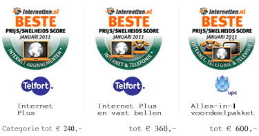 Telfort haalt opnieuw de hoogste score bij de internetabonnementen in de laagste prijscategorie. Online heeft hier de tweede plaats overgenomen van Tele2. Dat geldt niet voor Internet+Bellen, hier staat Tele met het 2-in-1 abonnement op de tweede plaats. Bovenaan prijkt wederom Telfort met Internet Plus + vast bellen. Kabelbedrijf UPC behaalt met het Alles-in-1 Voordeelpakket nog altijd de beste prijssnelheidsscore in de laagste prijscategorie Internet + Bellen + TV abonnementen. Ook hier staat Tele2 op de tweede plek.
