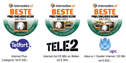 Telfort staat voor de 17e opeenvolgende keer op de eerste plaats in de categorie internet abonnementen met Telfort Internet Plus. Bij dit abonnement wordt een snelheid boven de 10 Mb/s gemeten, voor een prijs van minder dan 300 euro per jaar. Hiermee doet Telfort haar naam als prijsvechter dus alle eer aan! In deze categorie is er slechts een provider met een score van 5, derhalve laten we de providers achterwege die op plek 2 en 3 zijn geëindigd.