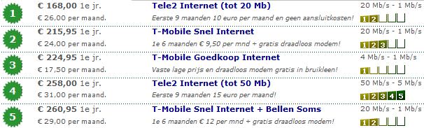 Voor Tele2 Internet tot 20 Mb komen de totale jaarkosten nu op 168 euro. Dat scheelt bijna 50 euro met T-Mobile Snel Internet. In de TOP 5 goedkoopste internetpakketten staan nu alleen de 'T-providers' Tele2 en T-Mobile, zowel bij de langzamere als de snelle abonnementen.