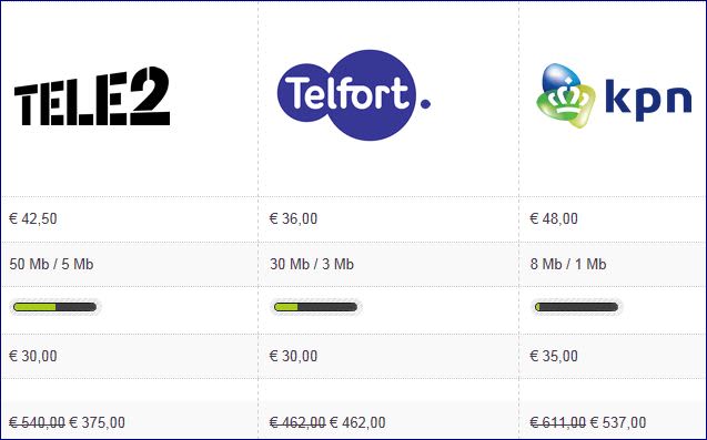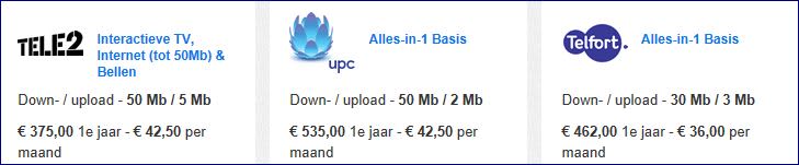Vergelijken we het basispakket van Tele2, Telfort en KPN op Totaalwijzer, dan blijkt alleen KPN duurder te zijn. Tussen UPC en Tele2 zit op jaarbasis maar liefst een verschil van 160 euro. Dat komt omdat je bij Tele2 het eerste halfjaar slechts 15 euro per maand betaalt. Ook Telfort is goedkoper, al krijg je daar wel een lagere snelheid. Merk op dat je bij de duurste ook de laagste downloadsnelheid krijgt: 8 Mb tegenover 50 Mb van UPC en Tele2.