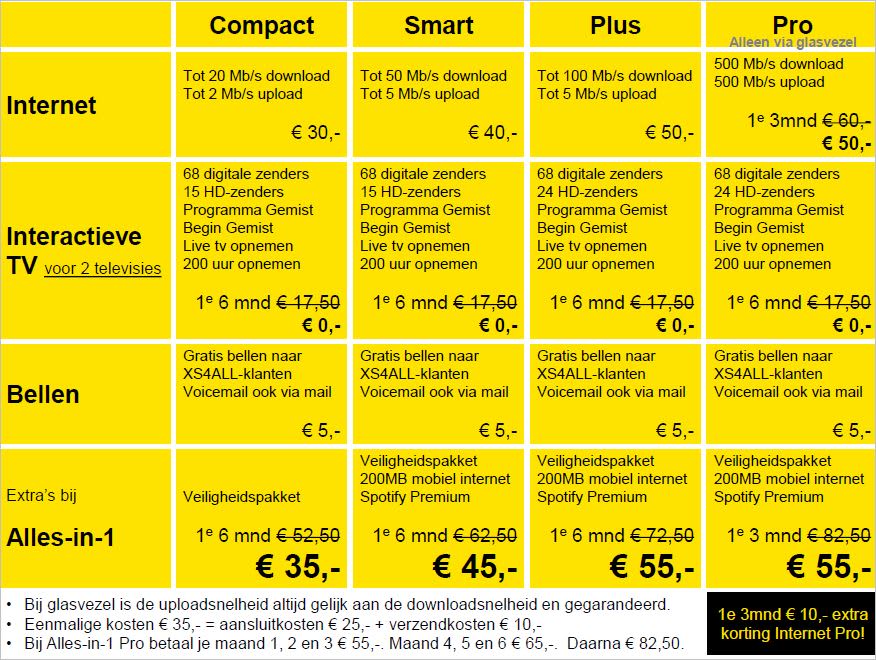Behalve de focus op glasvezel past XS4ALL ook de namen aan van de abonnementen. Compact (tot 20 Mbps) en Smart (tot 50 Mbps) vervangen de huidige pakketten Basis en Extra. Daarnaast lanceert XS4ALL een 100 Mbps abonnement via VDSL onder de naam 'Plus' en een 500 Mbps glasvezelabonnement onder de naam 'Pro'.