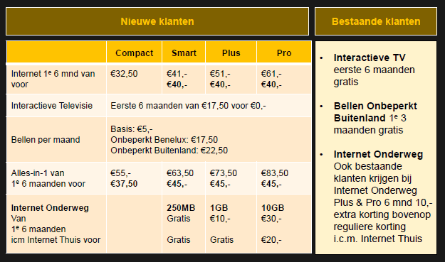 De actie geldt niet alleen voor Alles-in-1 pakketten. Ook op Internet en Internet+TV wordt de eerste 6 maanden korting gegeven. Zie onderstaande tabel voor een overzicht van de acties, waarbij onderscheid wordt gemaakt in nieuwe en bestaande klanten.