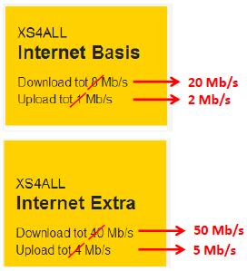 Internetprovider XS4ALL verhoogt de snelheden van haar DSL abonnementen. Internet Basis wordt verhoogd naar 20 Mbps download en 2 Mbps upload en Internet Extra gaat naar maximaal 50 Mbps download, en 5 Mbps upload.